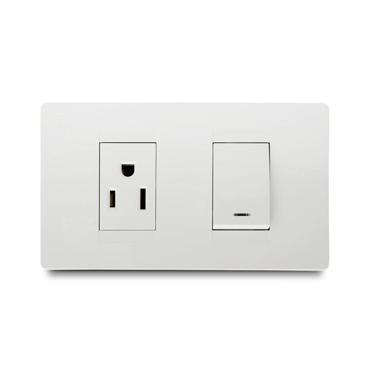 Color blanco, Toma 125/250v-15amp+interruptor con luz pilotot 125/250v-15amp, fabricado en policarbonato autoextinguible