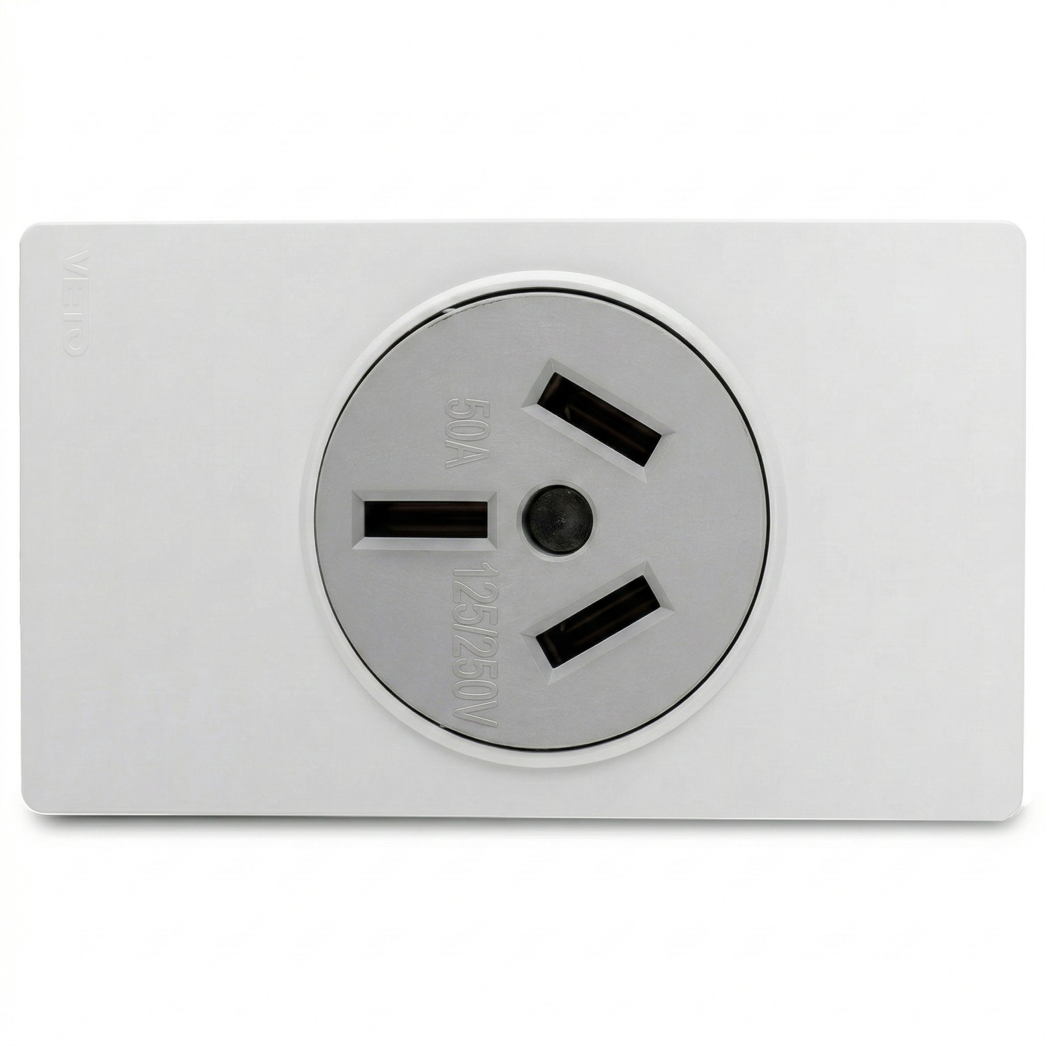 Color blanco con gris, 125/250v-50amp pata de gallina, fabricado en policarbonato autoextinguible